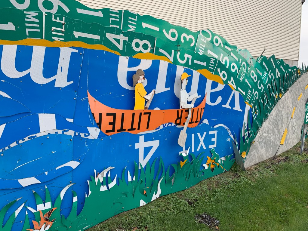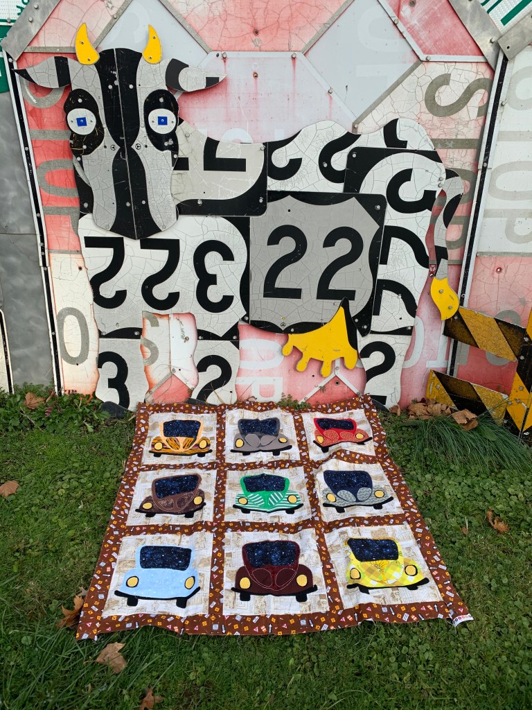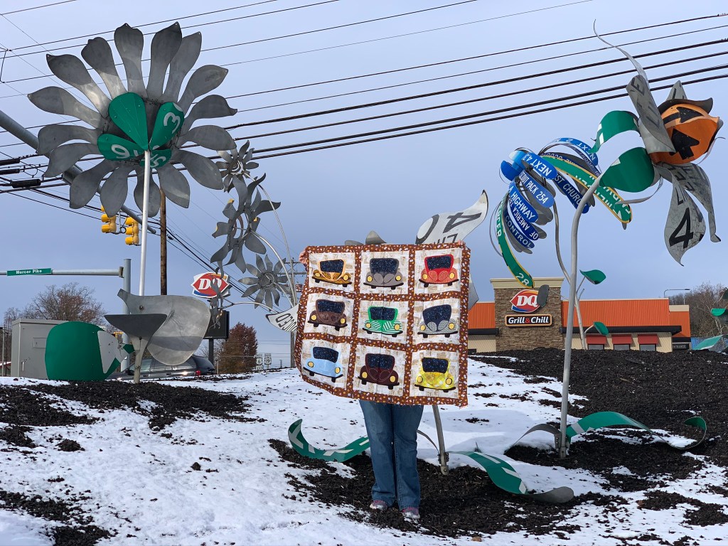 The week before we were going to visit baby Cole I remembered that there was a neat road sign sculpture garden in my friend’s town so I took the car quilt top for pictures with the sculptures.
